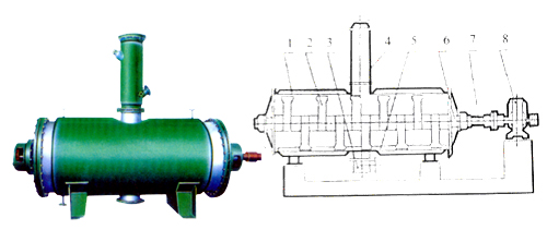 2、耙齒 3、出料裝置 4、加料裝置 5、粉碎棒 6、密封裝置 7、攪拌軸 8、傳動裝置 |
